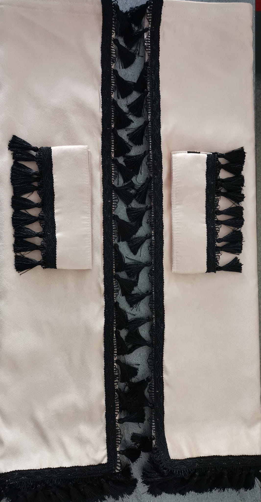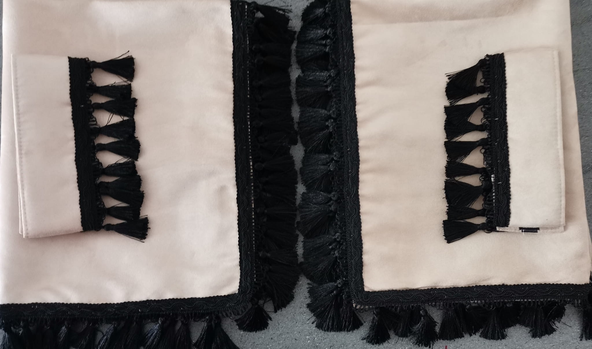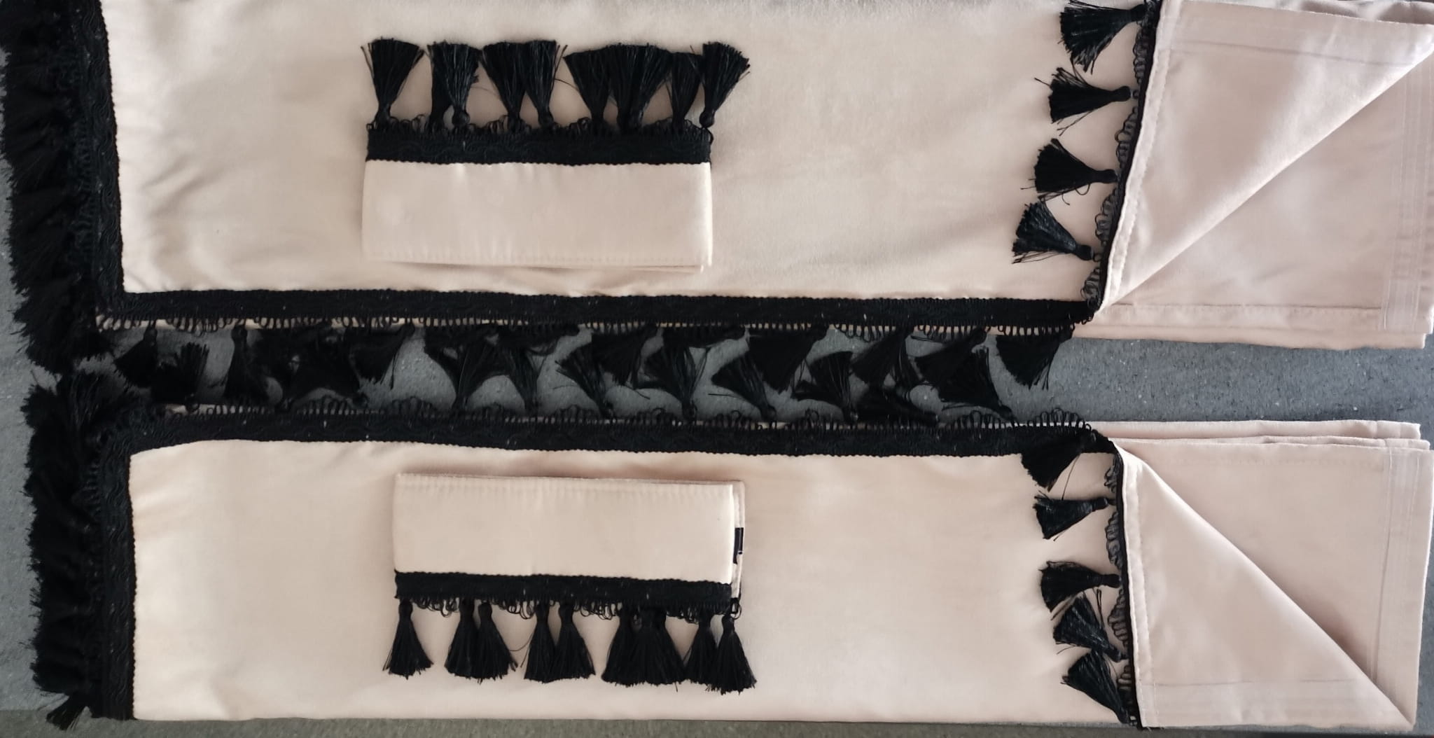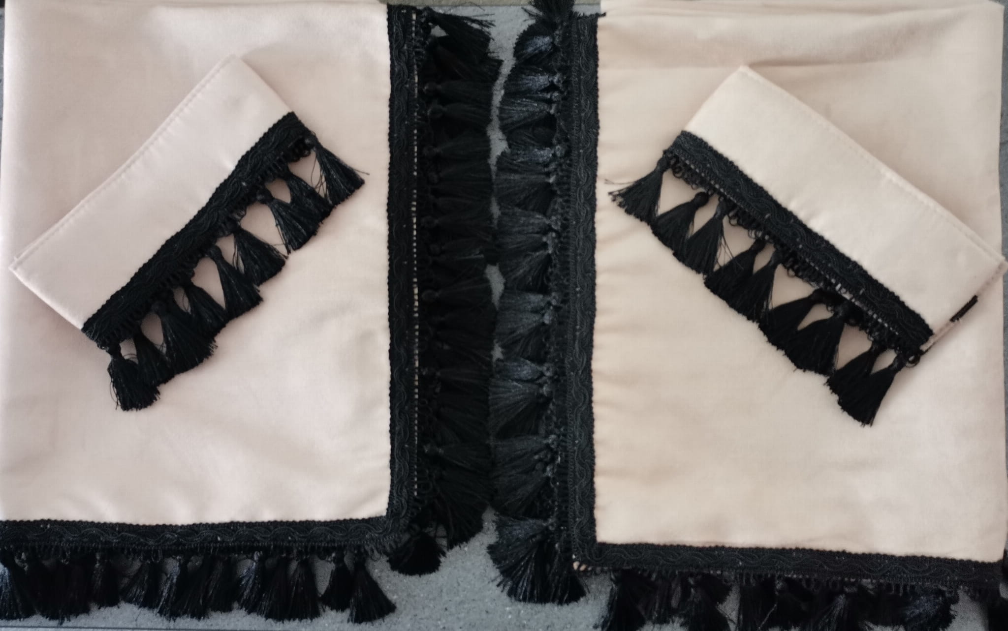 Zasłony obszyte są czarnymi frędzlami w kształcie dzwoneczków. Frędzlami obszyta jest część dolna i boczna każdej firany.
