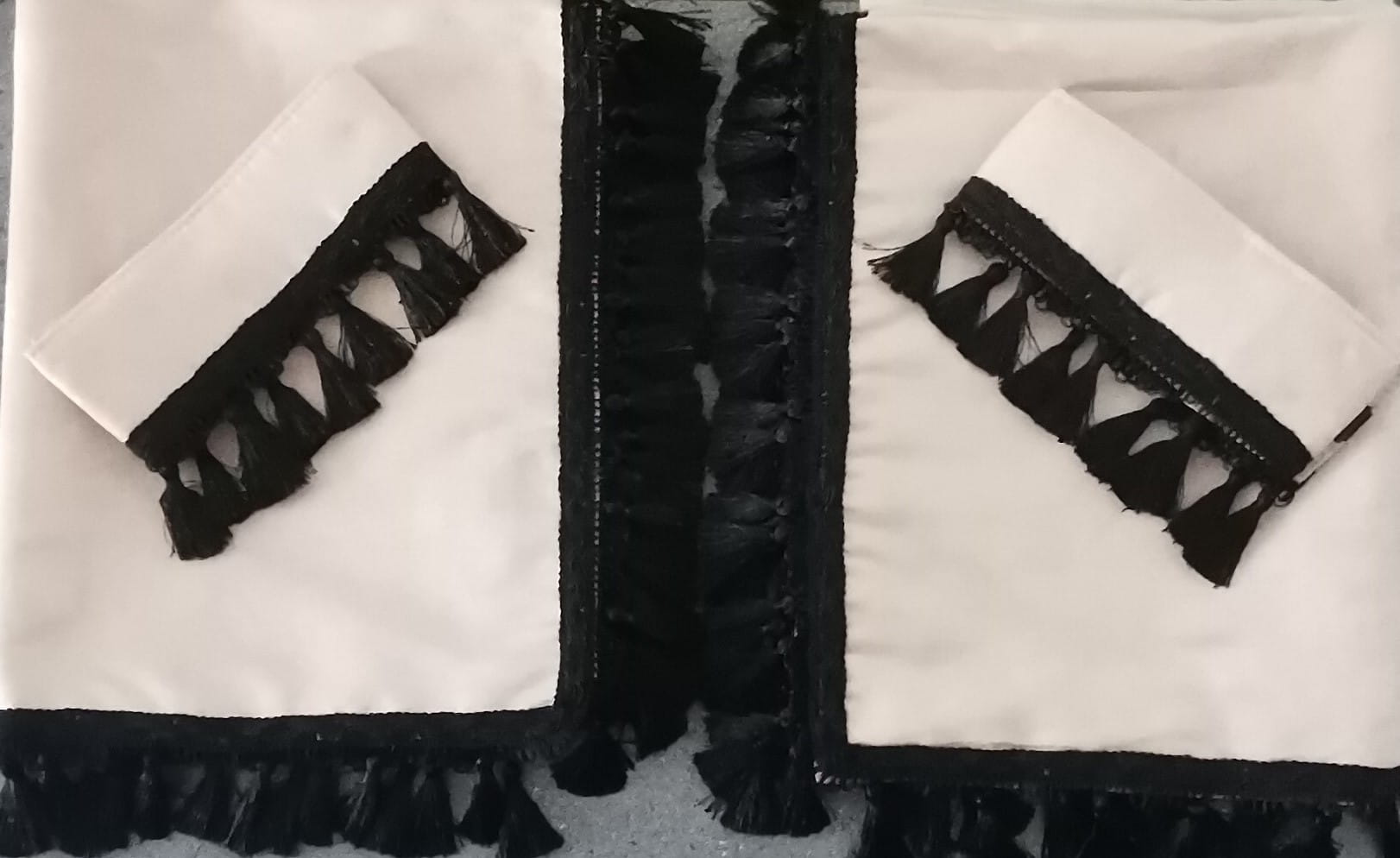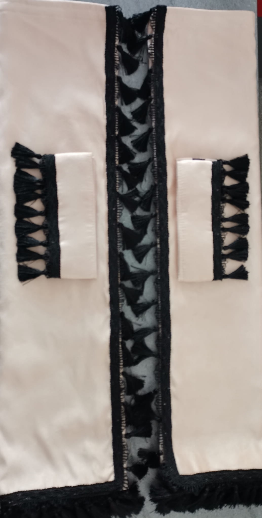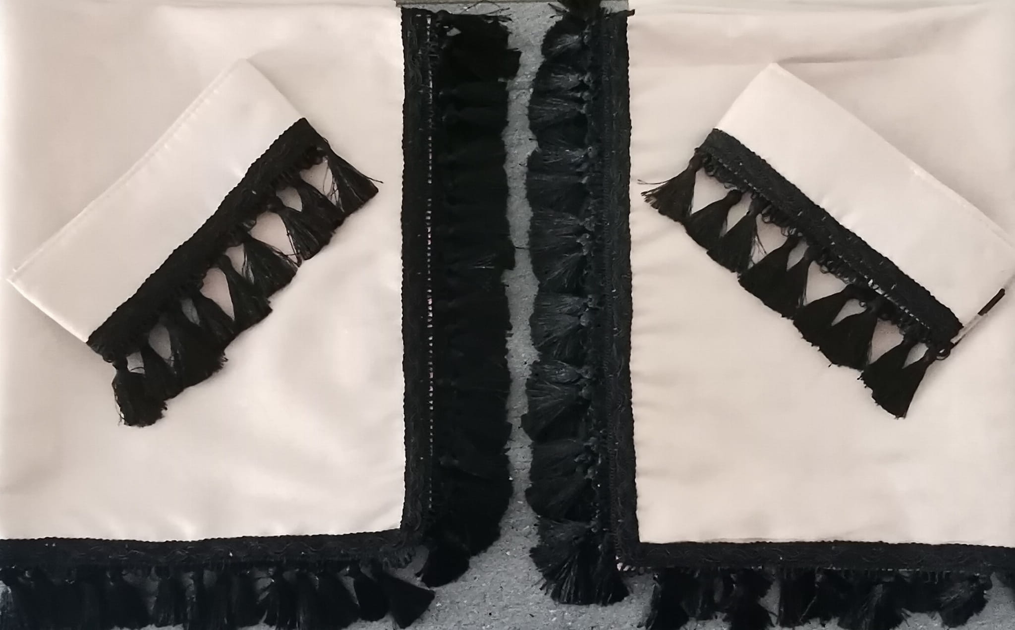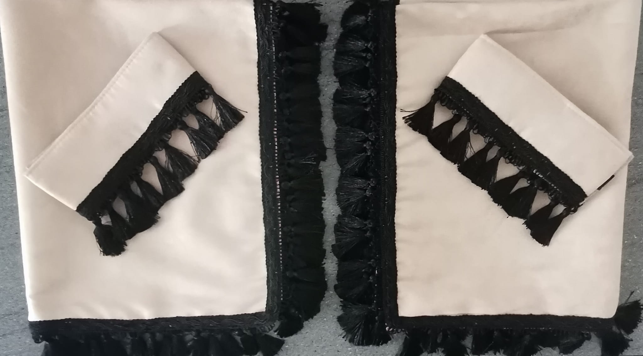 Zasłony obszyte są czarnymi frędzlami w kształcie dzwoneczków. Frędzlami obszyta jest część dolna i boczna każdej firany.
