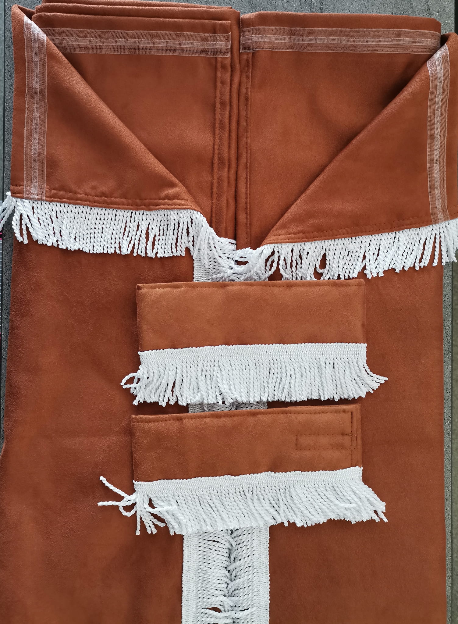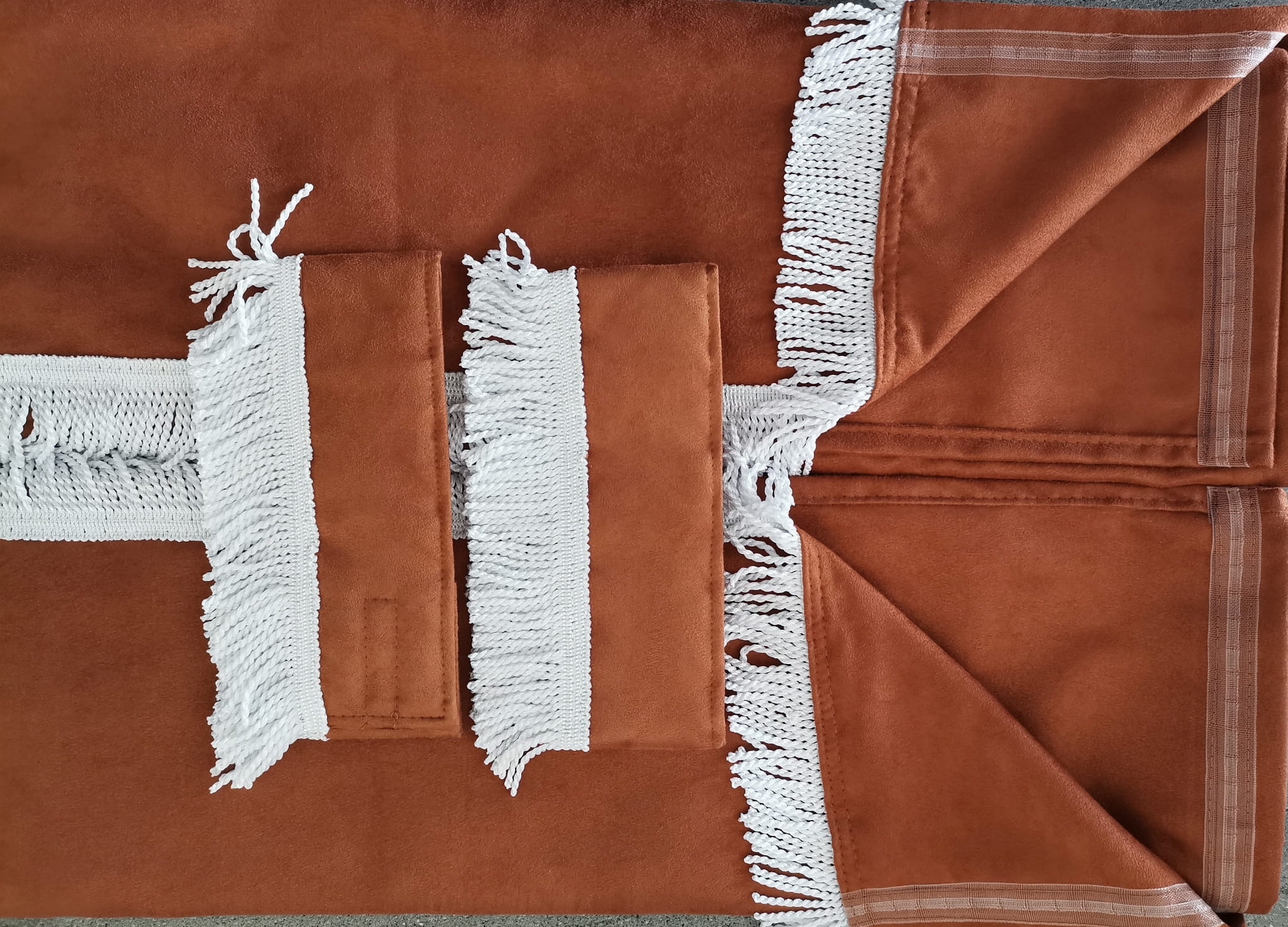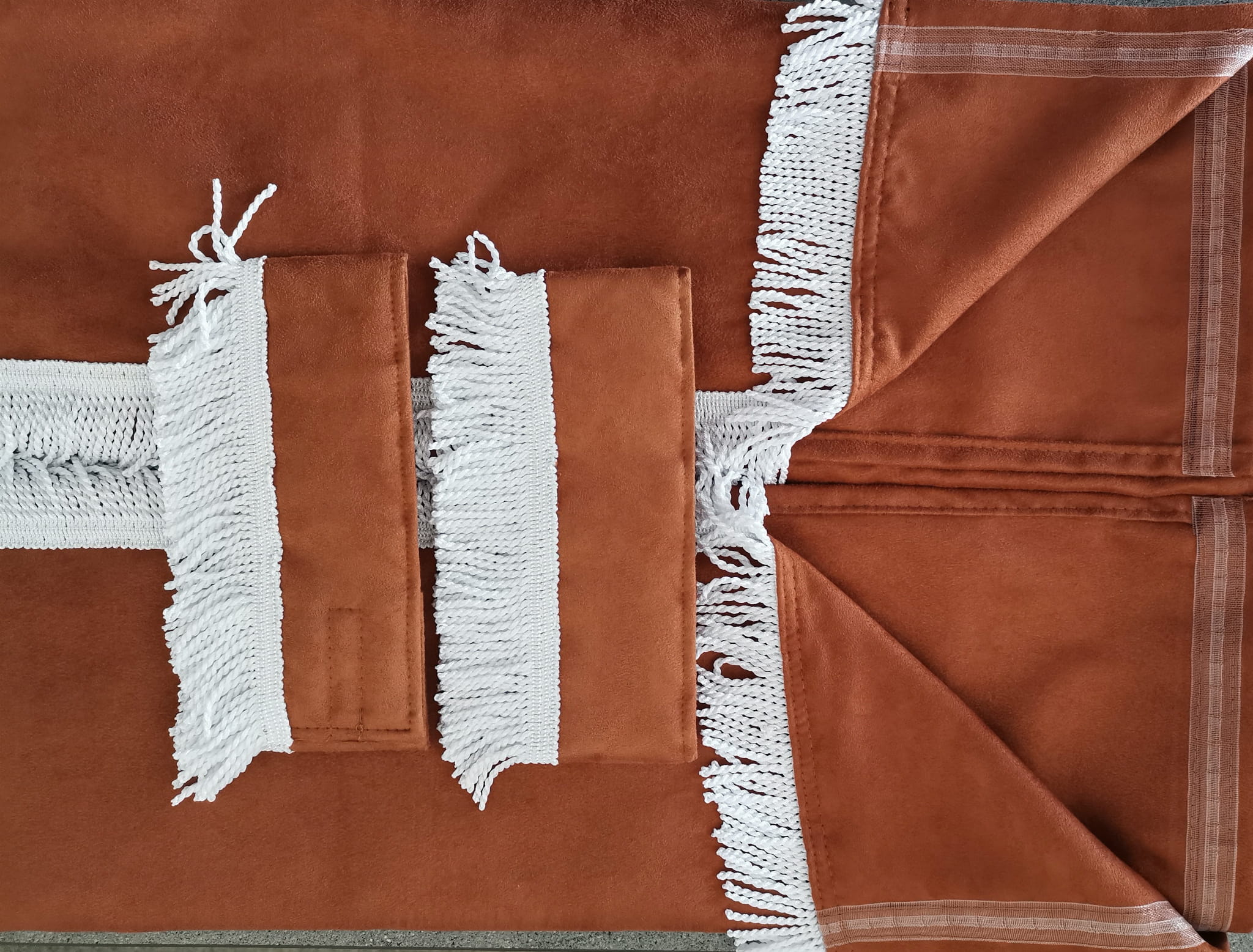 Zasłony obszyte są prostymi frędzlami w kolorze białym. Frędzlami obszyta jest część dolna i boczna każdej firany oraz ozdobne opaski mocujące.