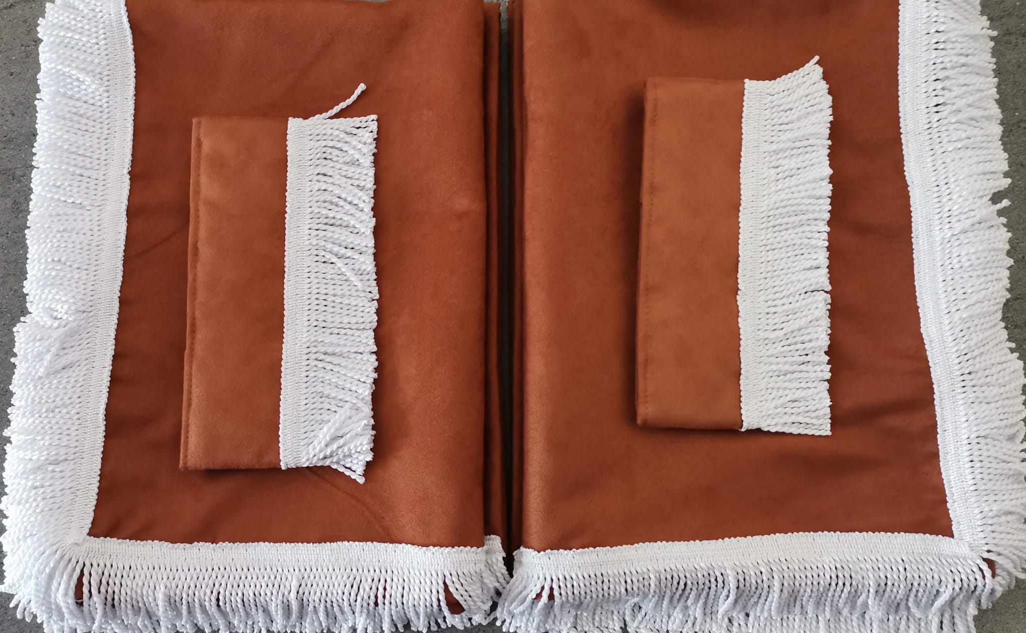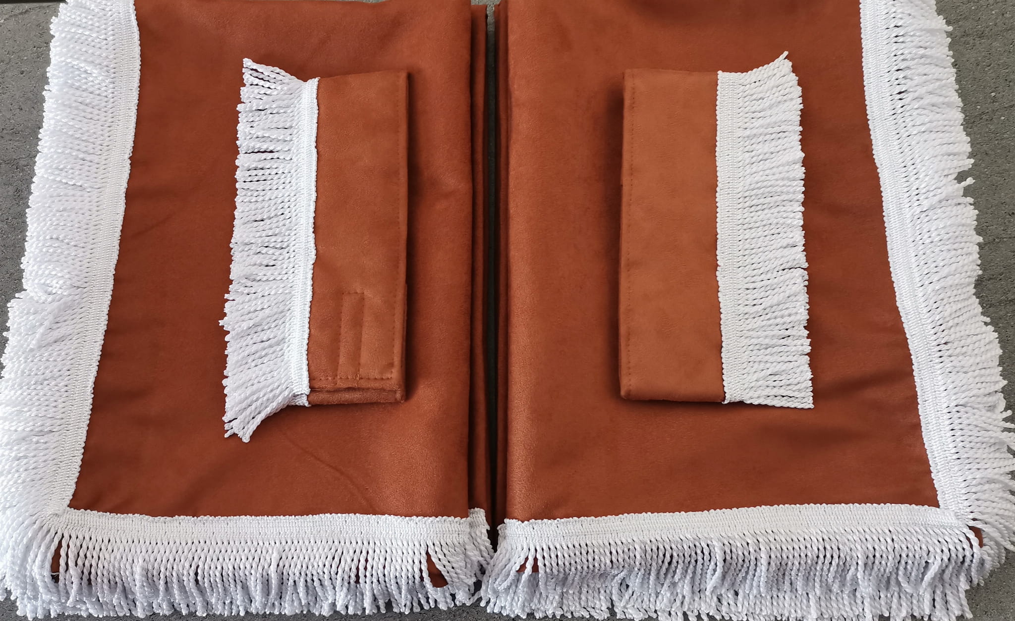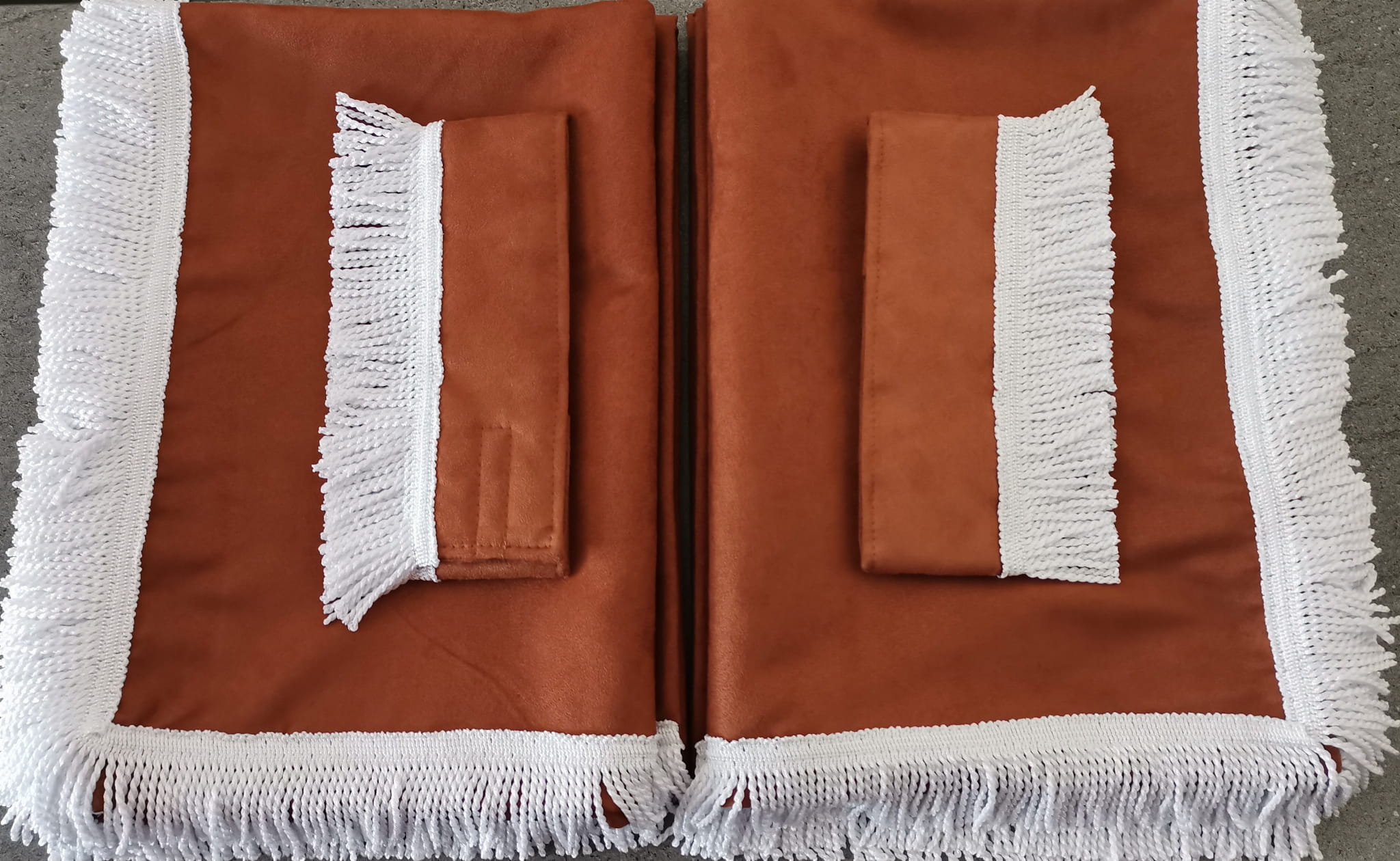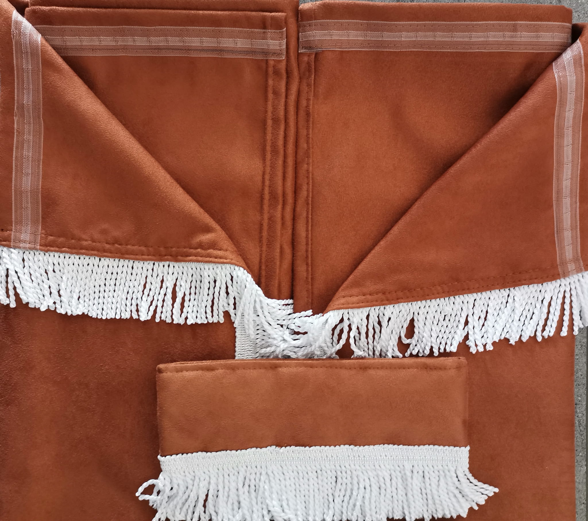Zasłony obszyte są prostymi frędzlami w kolorze białym. Frędzlami obszyta jest część dolna i boczna każdej firany oraz ozdobne opaski mocujące.