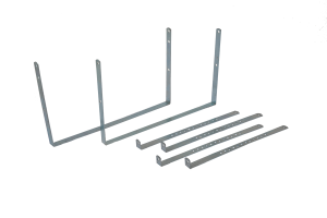 * zestaw składa się z 2 wsporników dolnych typu U, 4 uchwytów bocznych typu L oraz kompletu śrub, nakrętek i podkładek M10. Wsporniki są wykonane z wysokogatunkowej stali ocynkowanej o grubości 5 mm, szerokość wspornika 30 mm.